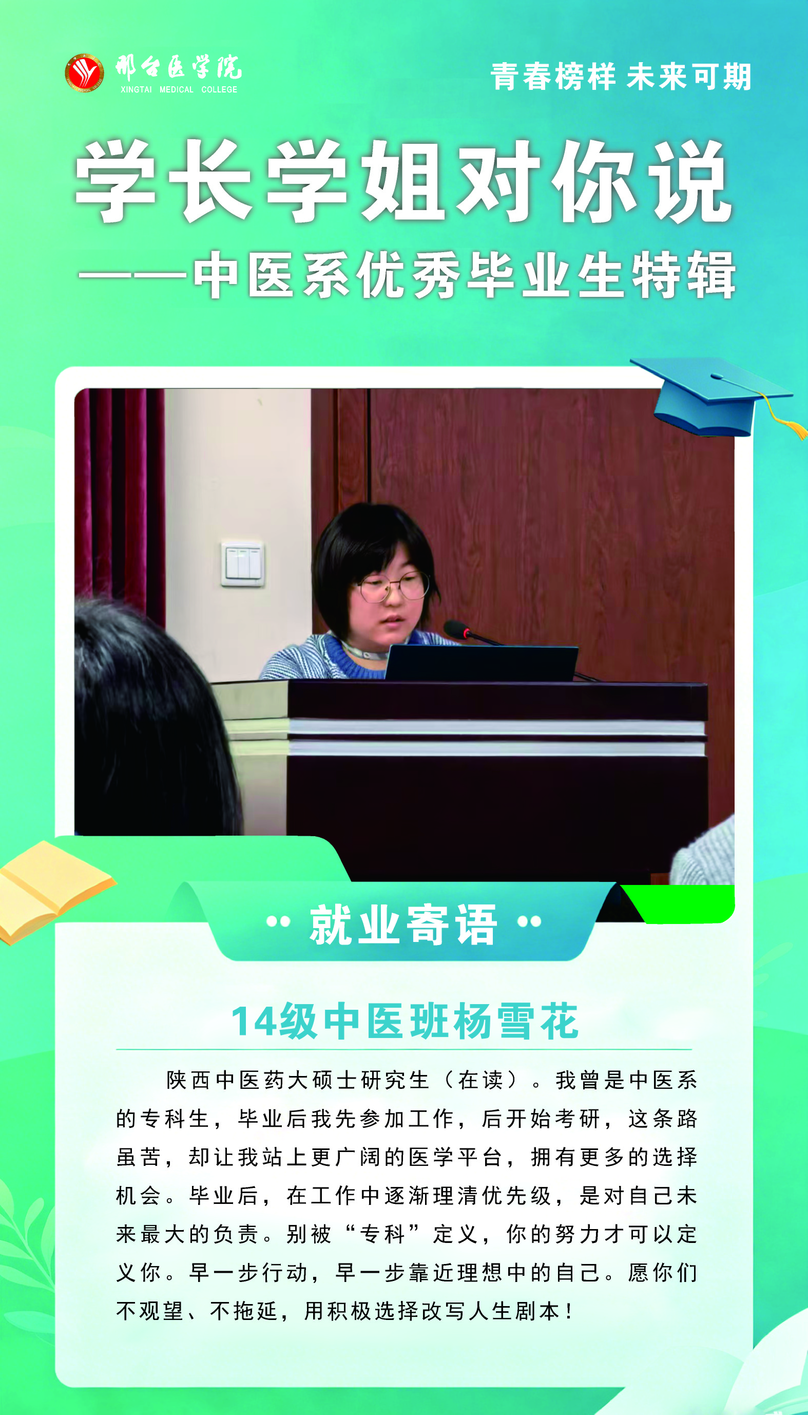 当前正值在校学子进行职业规划、求职就业的关键时期。为帮助同学们树立积极、正确的就业观与择业观,破解就业迷茫、走出“慢就业、缓就业”的误区,明晰职业发展方向,中医系特推出“优秀毕业生就业风采寄语专题展播”系列活动。我们将充分发挥优秀毕业生的榜样引领作用,以他们的真实经历与真诚寄语,激励在校学子坚定从医信念,勇担基层健康使命。