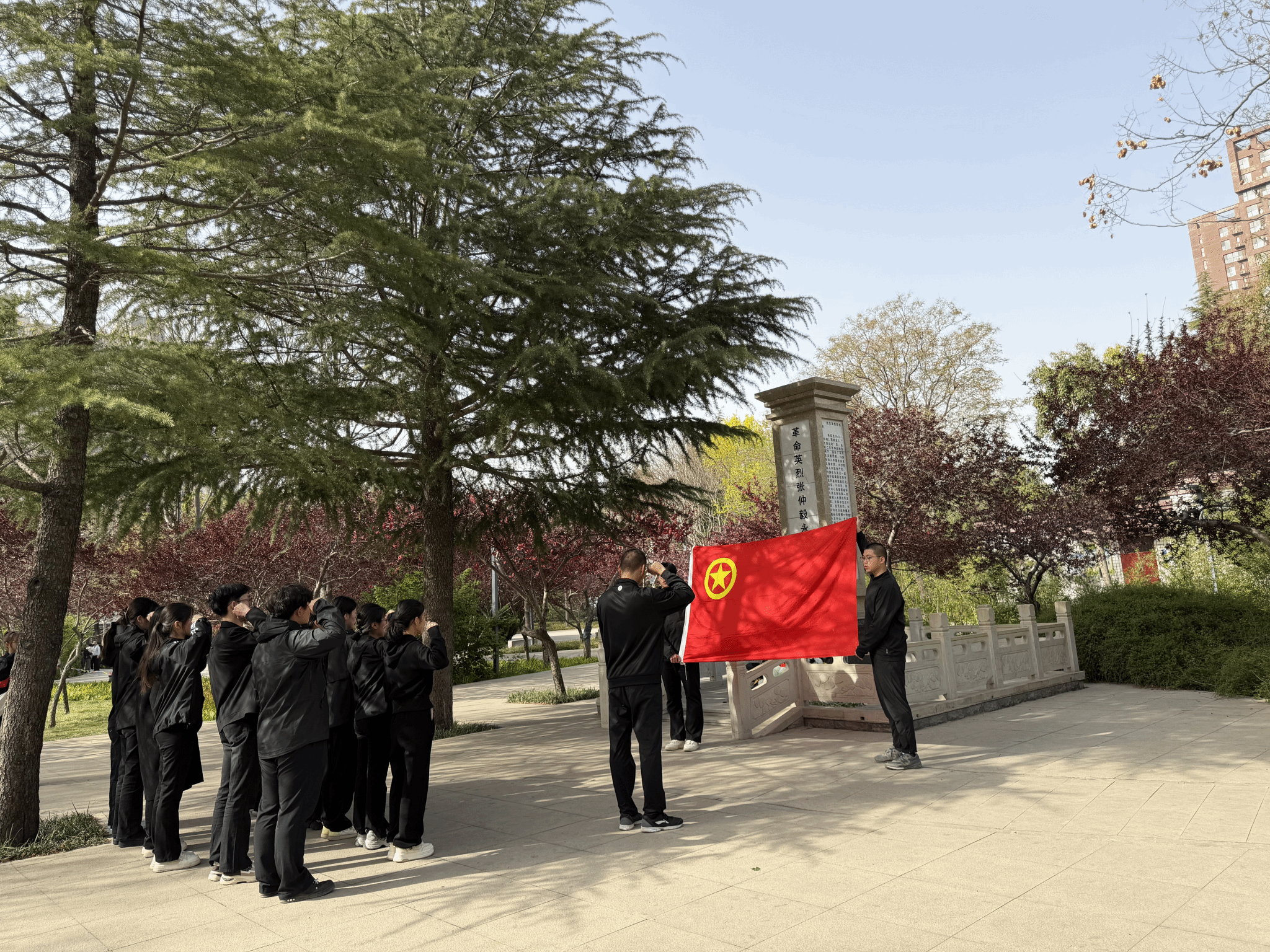 活动现场肃穆庄重,主持人引导全体人员肃立,开启这场涤荡心灵的红色精神洗礼。学生代表手持素菊依次敬献,寄寓对英烈的无限追思;全体同学垂首默哀,在静默中追忆先烈抛头颅、洒热血的峥嵘岁月,深刻感悟和平生活的来之不易。随后,全体团员面向团旗、高举右拳,在领誓人带领下重温入团誓词,铿锵誓言响彻现场,是对先烈遗志的郑重承诺,更是新时代青年勇担使命的坚定宣言。